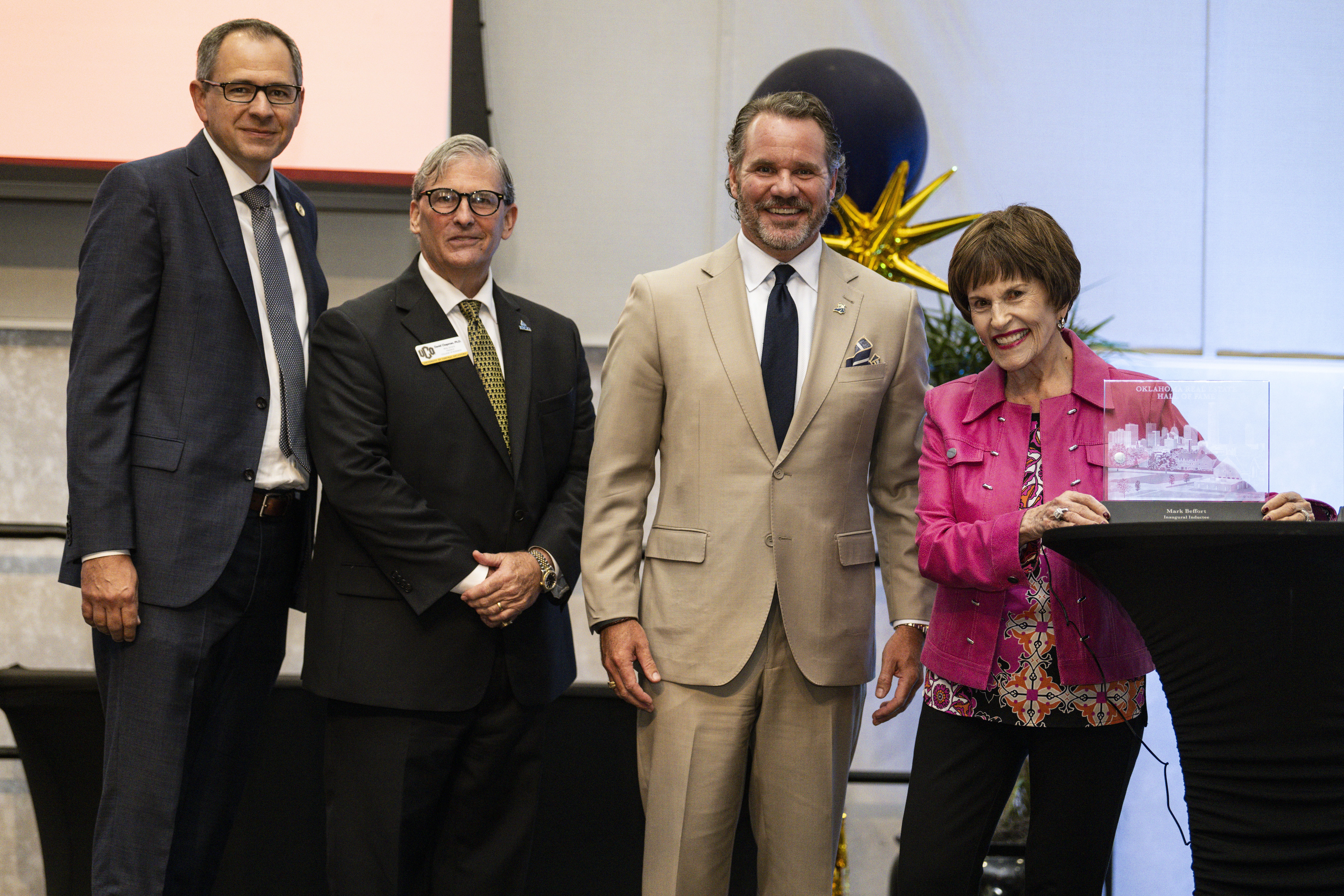 Cutline: The University of Central Oklahoma College of Business hosted the 10th Annual Commercial Real Estate Summit (CRE Summit), bringing together more than 250 professionals, including brokers, developers, investors, planners and policymakers, along with UCO real estate students to celebrate leadership and collaboration across Oklahoma’s commercial real estate industry. Pictured, from left to right, Russell Evans, Ph.D., dean of the UCO College of Business, David Chapman, Ph.D., chair and professor of finance and real estate at Central, UCO President Todd G. Lamb, and Mo Anderson, founder and former CEO of Keller Williams Realty.
